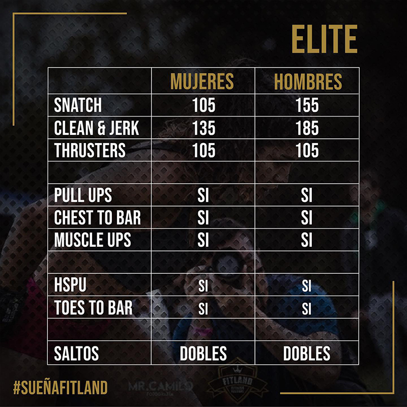 Las categorías participates en Fitland 2020 y cupos son Teen u-19 (36) , intermedio (54), avanzado (54), élite (36), rx (36) y masters (36), los parámetros son los siguientes.